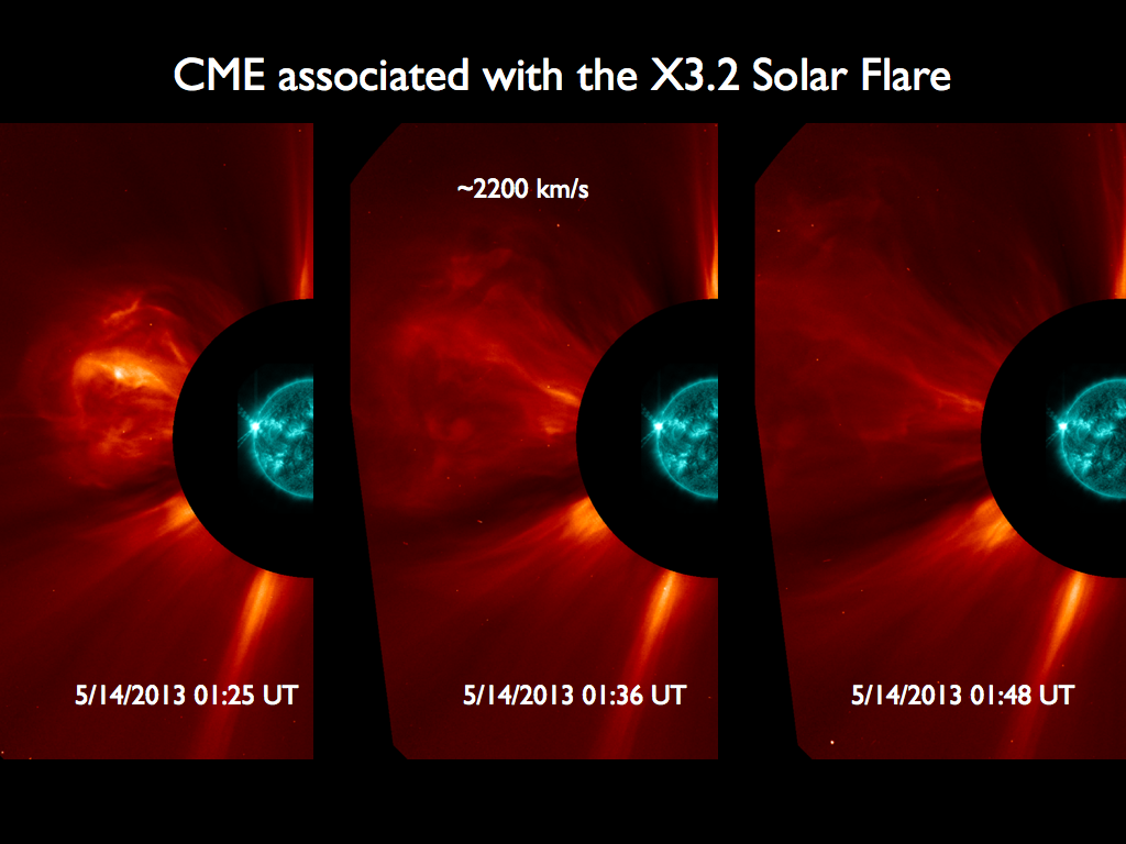 11:44 UT – The NASA GSFC Space Weather Research Center has estimated that the CME will merge with CMEs associated with the 2 X-flares (X1.7 and X2.8) and may give a glancing blow to STEREO B (~05/15/2013 18:00 UT) and Epoxi (~05/16/2013 00:00 UT) and hit Spitzer (~05/15/2013 06:00 UT).